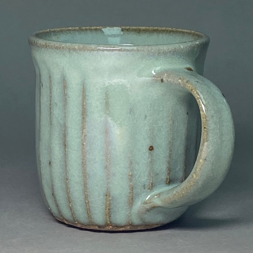 An elegant medium sized mug with blue glaze over fluted decoration.