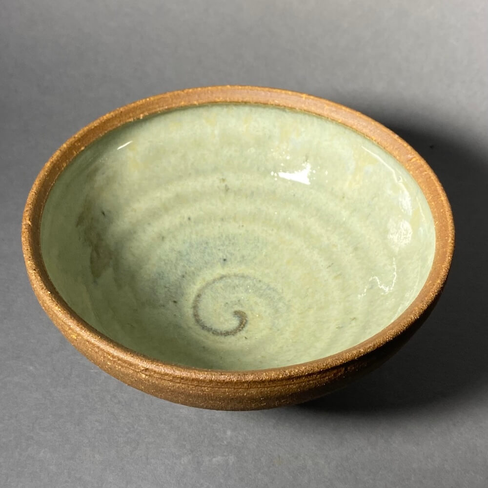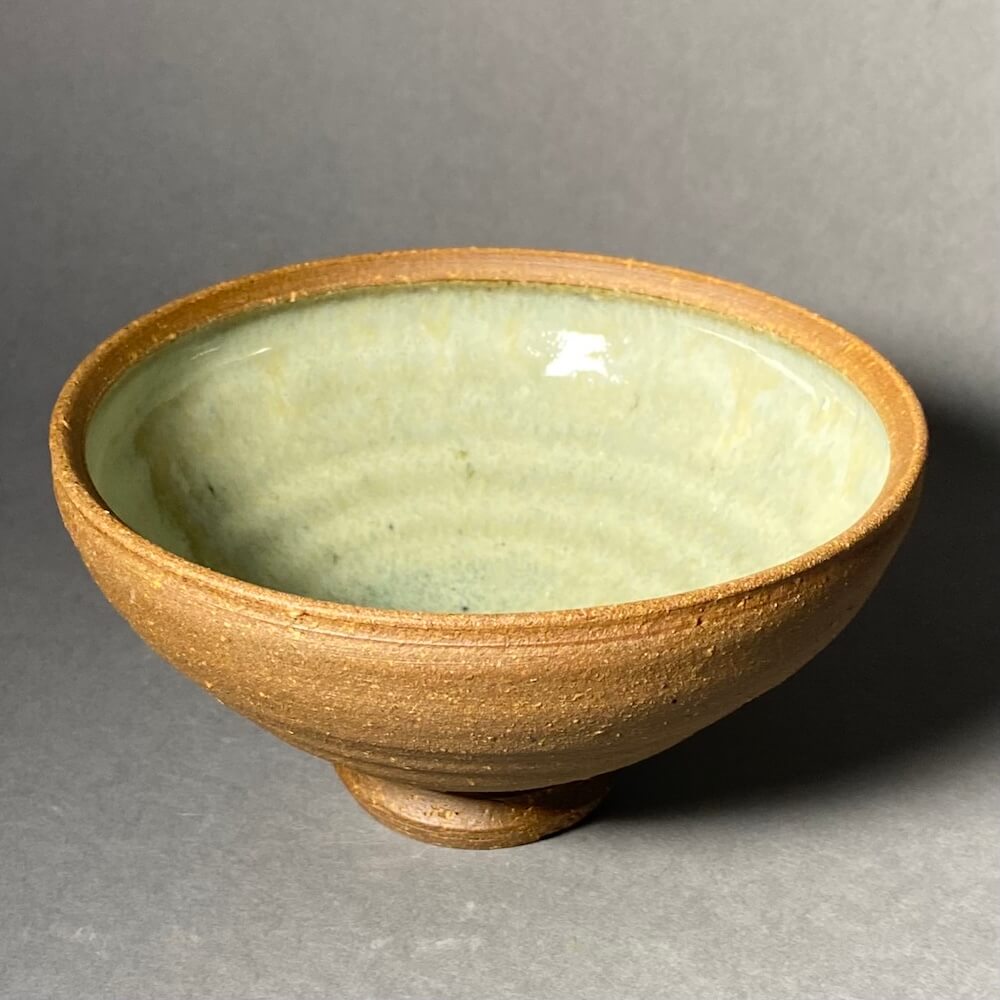 Dark clay and a soft green wood ash glaze.